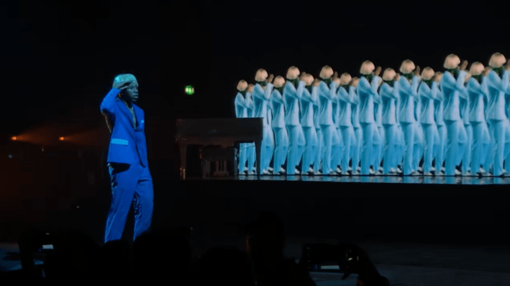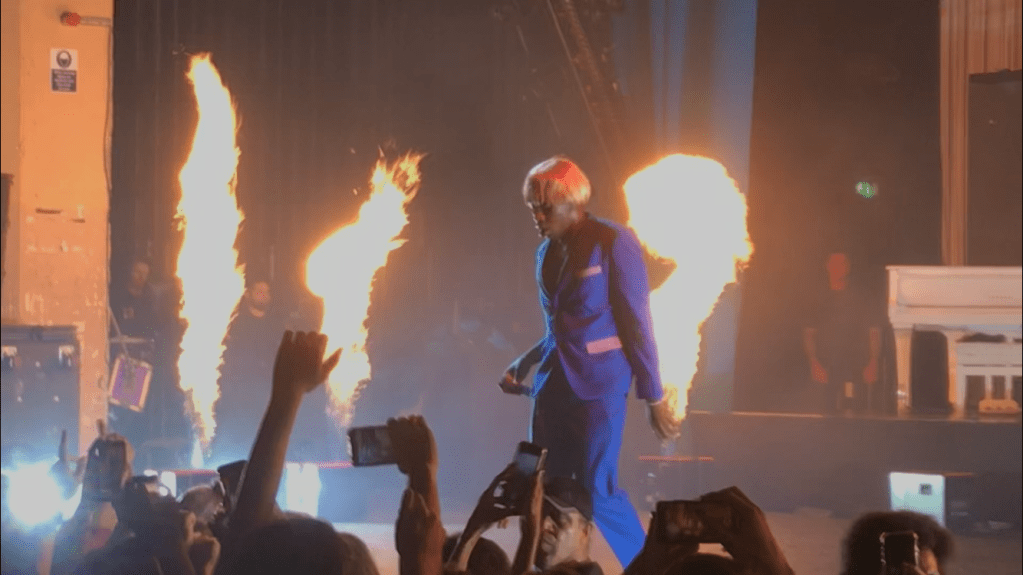 After taking the stage to ‘IGOR’S THEME‘, Tyler, the Creator jokes: “Haven’t seen a lot of you in a while.” He’s stood on stage alone, in a two-piece baby blue suit with a bleach blonde wig atop his head. He’s already soaking in sweat after just one song; but he’s also soaking in the atmosphere of his second sold-out show on his long-awaited return to the UK. The crowd, most of whom looking like they’re wearing their most fashionable clothes for the affair, all start chanting in unison: “F#%k Theresa May“. The disdain for the former PM isn’t just edgy political protest – during her stint as home secretary back in 2015, May banned Tyler from entering the country, due to the controversial nature of his performances and his lyrical content.