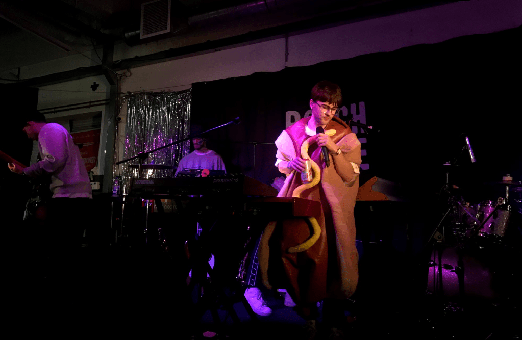 Leicester five piece Easy Life are an unconventional group, perfectly fusing pop and indie-rock and jazz impeccably. Keeping with their unconventional nature, Murray Matravers, the frontman of the group, takes to the stage at a sold out Rough Trade East wearing a full hotdog costume. It’s all a part of the promo for their brand new EP: ‘Junk Food‘, released a week prior. Easy Life still haven’t released a full studio album, but after earning second place on the BBC’s Sounds of 2020 shortlist and with their new 7 track EP, it is clear there are big things ahead for the group.